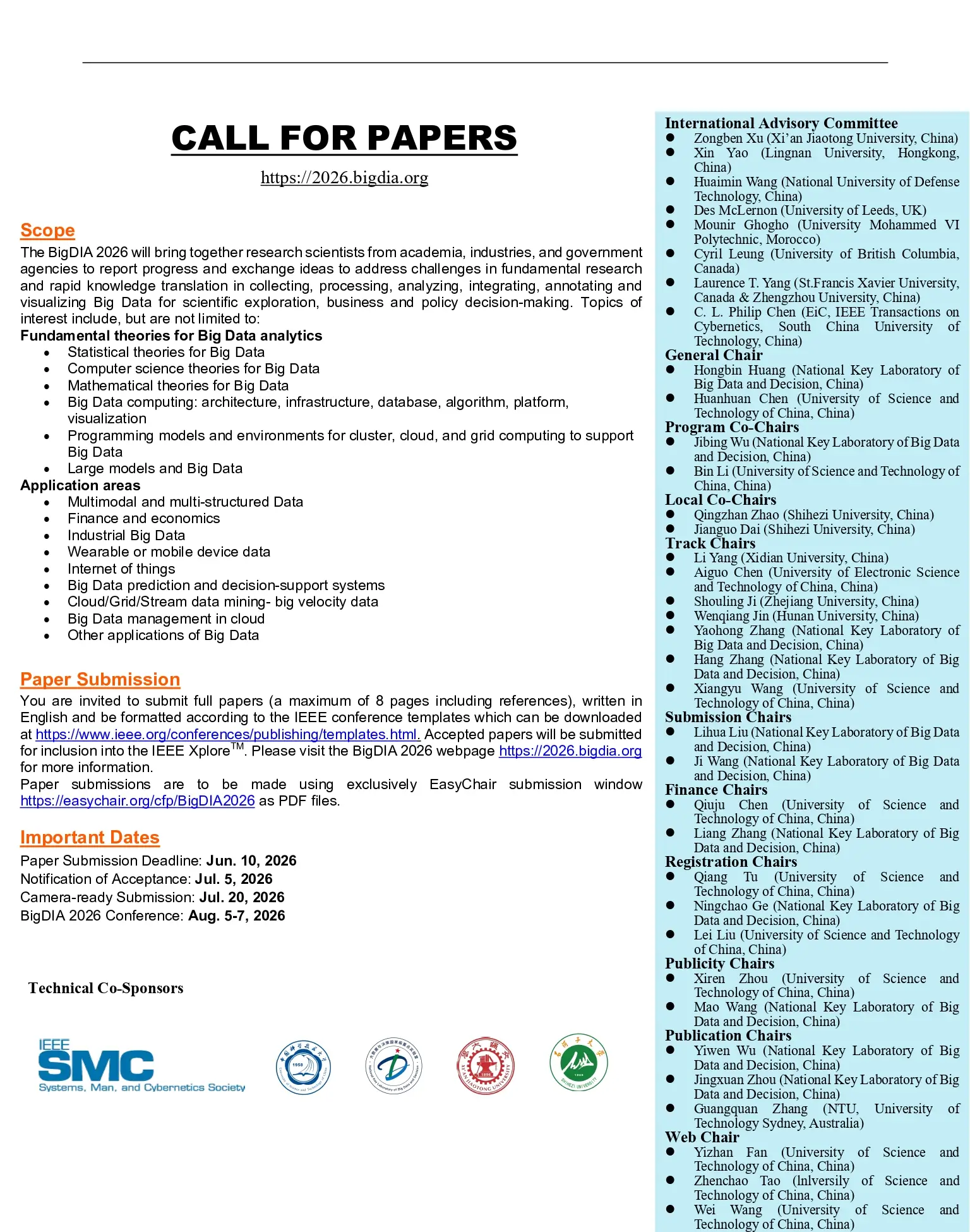 Paper submissions are to be made using exclusively EasyChair submission window https://easychair.org/cfp/BigDIA2026 as PDF files.